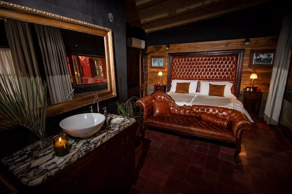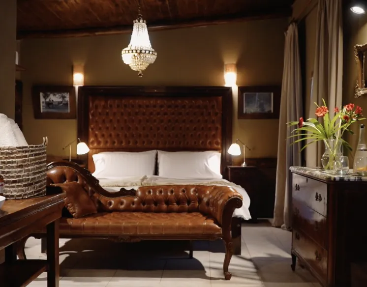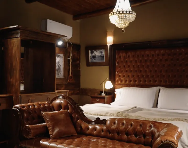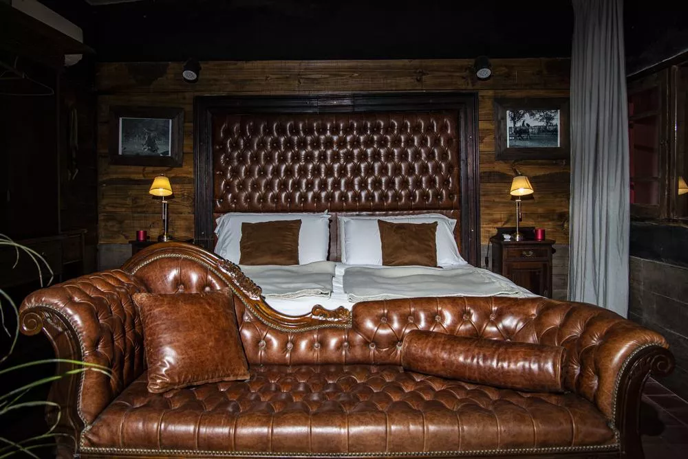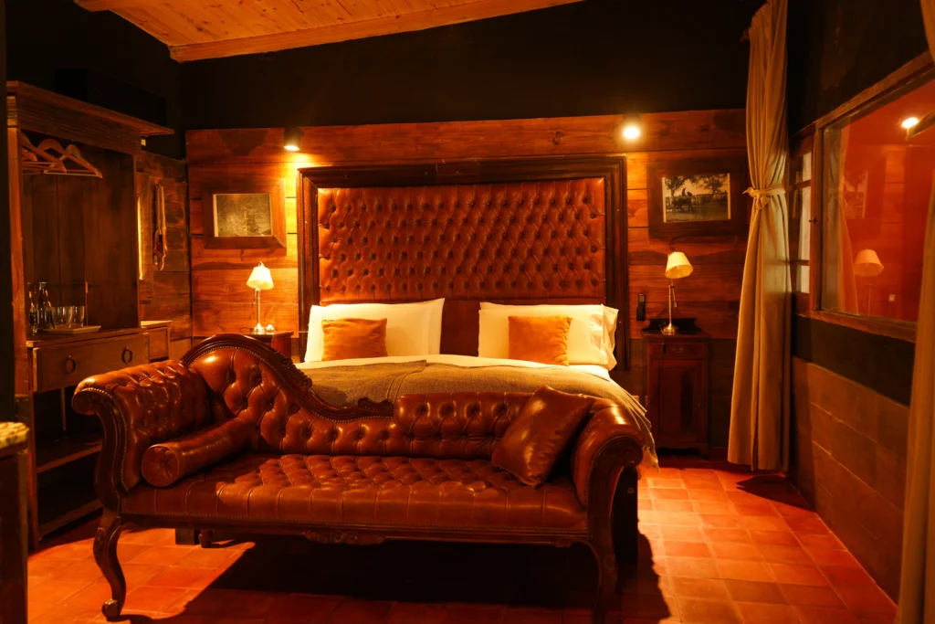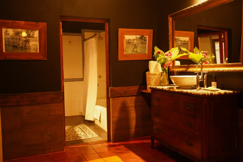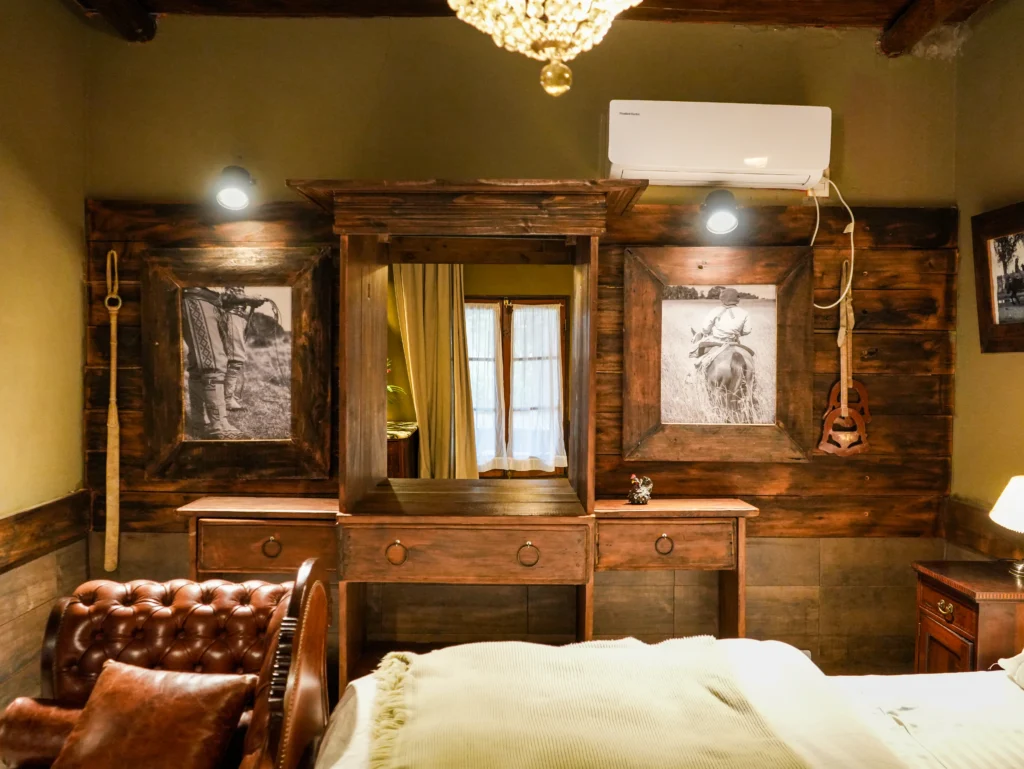 El Federal is a 33 m² room overlooking the estancia’s inner courtyard. It features a king-size bed, an antique wardrobe, a French-style crystal chandelier, and a beautiful locally-sourced leather sofa, creating a refined and classic atmosphere. The room includes a private bathroom with both bathtub and shower, as well as its own gallery with an outdoor seating area. Its central positionoffers a close connection to daily life on the estancia, being next to the main living/dining room.