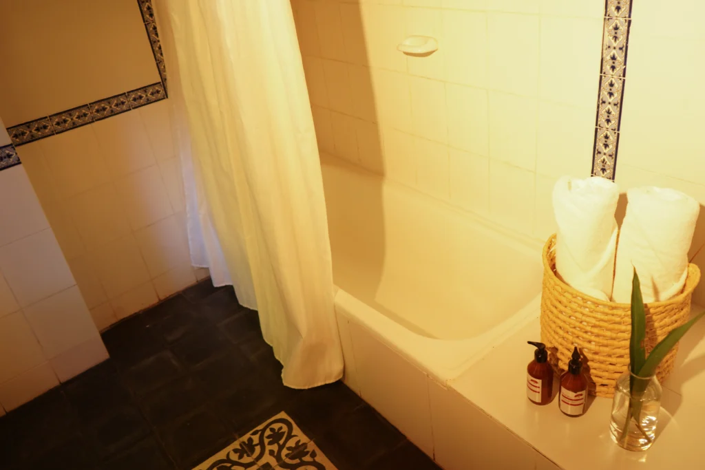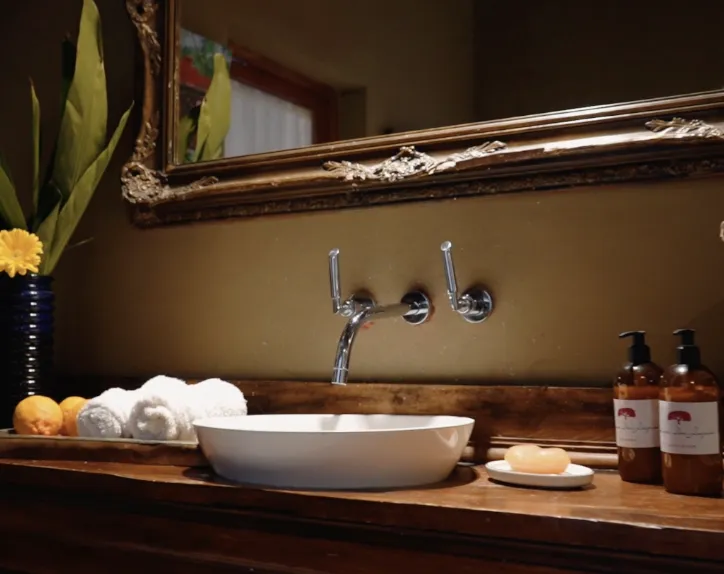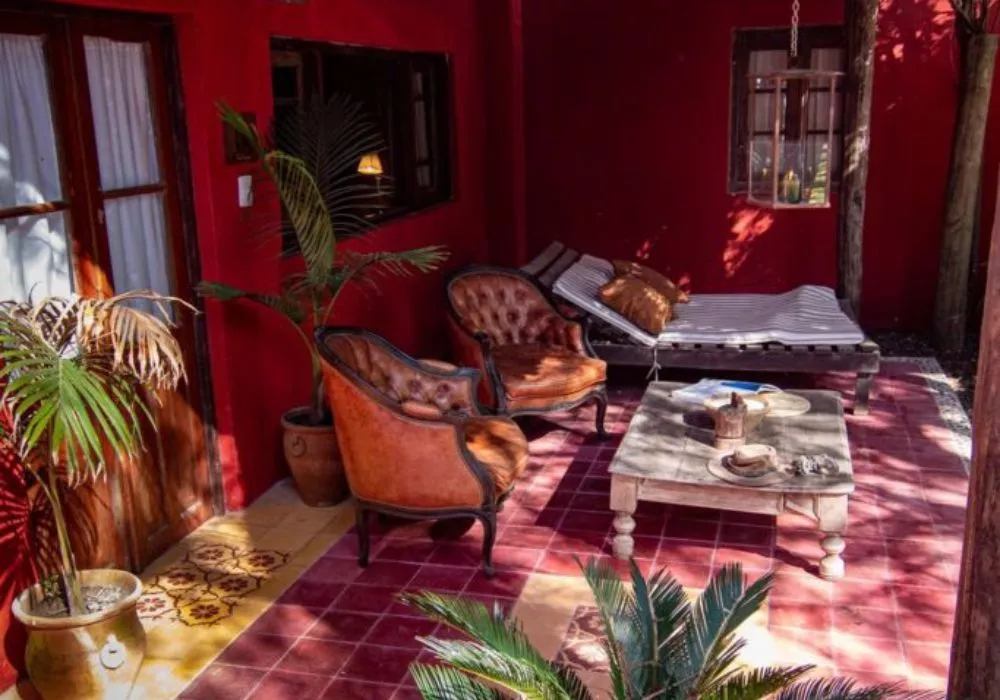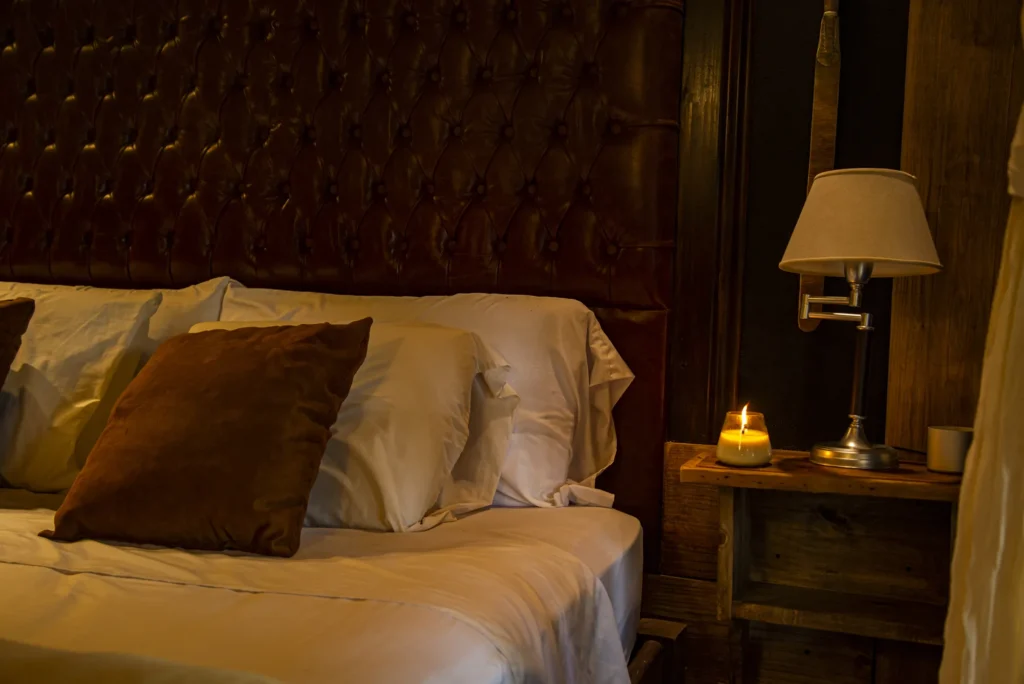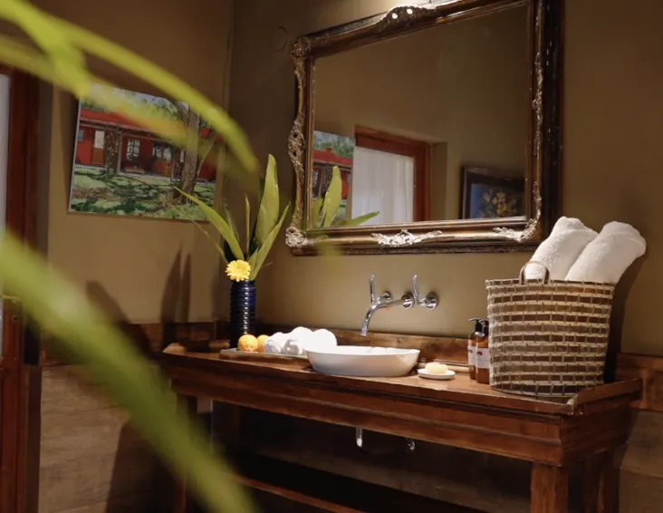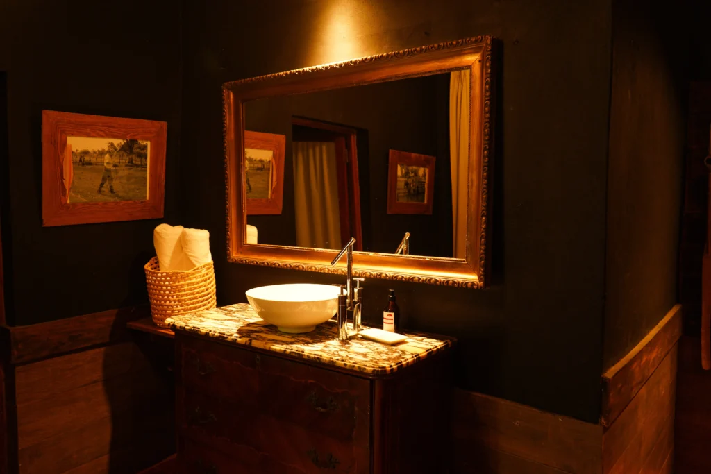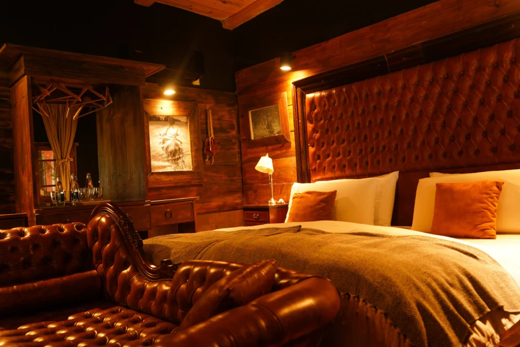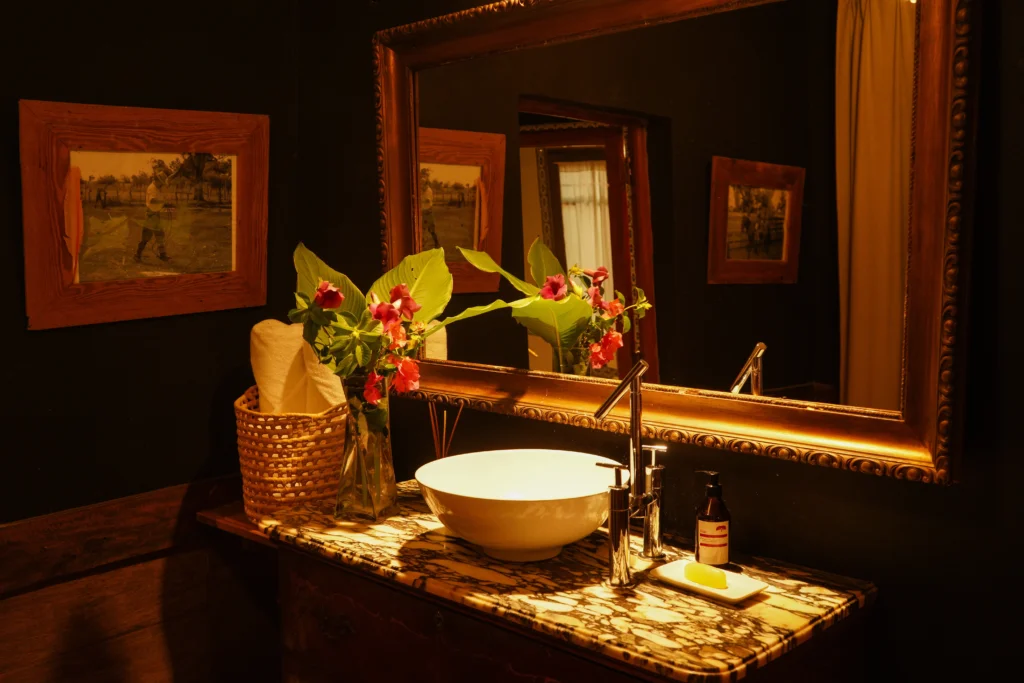 El Federal is a 33 m² room overlooking the estancia’s inner courtyard. It features a king-size bed, an antique wardrobe, a French-style crystal chandelier, and a beautiful locally-sourced leather sofa, creating a refined and classic atmosphere. The room includes a private bathroom with both bathtub and shower, as well as its own gallery with an outdoor seating area. Its central positionoffers a close connection to daily life on the estancia, being next to the main living/dining room.